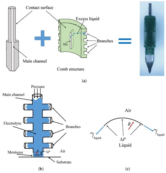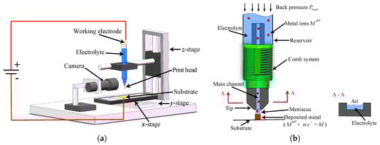 The proposed ECAM system is shown in Figure 1a. Movement of the print head is controlled by the , and stages. The design of the print head is schematically illustrated in Figure 1b. A microfluidic system, which is referred to as the fountain pen feed system, is proposed. This fountain pen feed system consists of the main channel part and the comb structure, which is further illustrated in details in Figure 2a. During the printing process, the electrolyte in the reservoir flows through the main channel to the tip by gravity and capillary action. At the same time, with the semi-open design of the main channel (as shown in the A–A cross-section of Figure 1b), air can also flow through the main channel into the reservoir, thereby providing a sufficient back pressure for continuous transport of electrolyte to the tip of the print head. When a positive potential is applied between the working electrode and substrate, the metal ions within the meniscus are deposited on the substrate through the reduction of . The meniscus moves with the print head according to a programmed path, and the materials are subsequently deposited at the designated locations to form the desired structure.