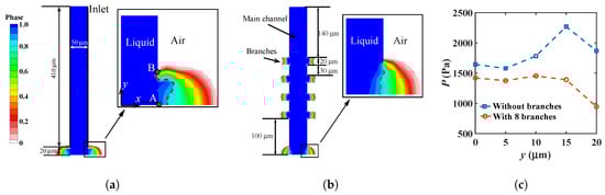 As shown in Figure 3a,b, two 2D simulations were performed. There are no branches for the simulation in Figure 3a, and for the simulation in Figure 3b, eight branches are located symmetrically with respect to the main channel. The width of the branch channel is 20 µm and the distance between adjacent branch channels is 30 µm. A constant pressure of = 2000 Pa was applied at the inlet for both simulations shown in Figure 3a,b. The volume of fluid (VOF) approach in Fluent was used to track the interface of the liquid and air. Water was taken as the liquid in the simulations and the material parameters employed in the simulations are tabulated in Table 1. For the phase field shown in Figure 3a,b, air is represented by while water is represented by . Rectangular elements with the mesh size of 0.004 mm × 0.004 mm are used and the time increment is s.