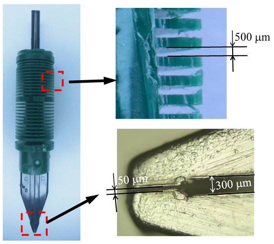 A commercially obtained fountain pen, as shown in Figure 4, was employed as the print head. The tip of the main channel was machined by a laser engraving machine (Branded Hans Laser) to control the width in the range of 50–300 µm. The width of the slit in the comb structure was ∼400 µm. The material used for the main channel and the comb structure was acrylonitrile butadiene styrene plastic (ABS).