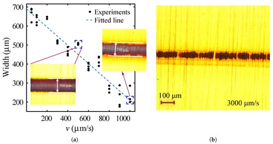 (a) Printed line width as a function of printing speed. (b) An optical microscope image of the printed line with the speed of 3000 µm/s.