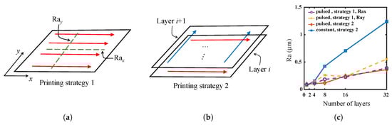 A copper square with the length of 2 mm was printed on the brass substrate. Two printing strategies, as shown in Figure 6a,b, with the constant and pulsed potential were investigated. The distance between two adjacent printing lines was 100 µm. For Printing Strategy 1 (see Figure 6a), the print head moves along the x-axis for all the layers; in Figure 6a is the surface roughness measured along the x-direction, which is parallel to the printing direction, while is the surface roughness measured along the y-direction, which is perpendicular to the printing direction. For Printing Strategy 2 (see Figure 6b), the printing direction rotates 90 after printing each layer, and the surface roughness Ra is measured for both the x- and y-directions. The Ra values shown in Figure 6c were averaged by measuring three samples, and, for each sample, at least five different locations were analyzed.
