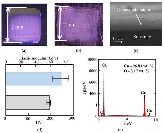 (a) A copper square printed on the polished brass substrate for two layers. (b) A copper square printed on the unpolished copper substrate for two layers. (c) SEM image of the side view of a copper square printed on the brass substrate for 32 layers. (d) Elastic modulus and Vickers hardness for the printed copper square. (e) EDX of the printed copper square.