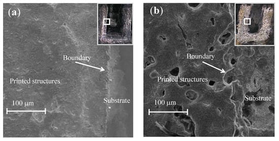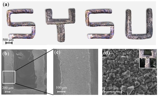 The letter “U” printed under pulsed and constant potential are also compared in Figure 9a,b. The SEM images show that the pulsed potential results in denser morphologies with sharp boundaries (see Figure 9a), whereas the structures printed under the constant potential have a porous morphology (see Figure 7b). This is mainly because the pulsed potential can provide a higher current density, which favors the initiation of grain nuclei and leads to finer-grained deposition []. Again, The two letters “U” shown in the boxed area of Figure 9a,b are unedited images without removing the substrate.