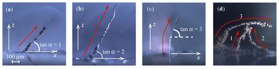 A few attempts were also made to print free standing copper pillars, which are shown in Figure 10. Figure 10a,b shows the printed copper pillars with slopes of 1 and 2, respectively, where is the angle with respect to the x-axis. Figure 10c is a printed vertical pillar followed by a pillar with the slope , and Figure 10d is a mixed structure with the overhanging pillars. The red arrows indicate the movement paths of the print head, and the numbers in Figure 10d represent the printing path sequence. The printed pillars with slopes in Figure 10a–c were achieved by alternately moving the print head a distance of µm along the x-axis and along the z-axis. The movement paths in Figure 10d were also realized by controlling the movement distances of the x- and z-stages via a computer program. The speed of the print head was controlled to a low value (3 µm/s) for both the x- and z-stages. The diameter of the printed pillars in Figure 10 is ∼50 µm, and dendritic morphologies can be observed in all structures. As explained in [], when printing structures such as those in Figure 8, movement of the print head within the x–y plane results in mechanical removal of the dendrites. However, for the structures shown in Figure 10, without the aid of mechanical removal, dendrites are easily formed due to preferential deposition at the center of the meniscus, which could be improved by applying an appropriate type of potential [,]. Nevertheless, Figure 10 demonstrates the ability of the proposed ECAM system to print structures with small overhanging angles.