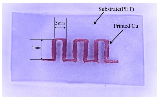 A circuit printed on the PET substrate was attempted to present a potential application with the proposed ECAM system. As the PET substrate was non-conductive, a thin copper film was first deposited on the PET substrate as the seed layer through the vacuum vapor plating technology. The thickness of the seed layer was 150 nm. This thickness ensured good chemical and mechanical properties of the deposited copper [] and good adhesion between the substrate and the seed layer []. The proposed printing process was then performed on the seed layer to fabricate the designed patterns. Finally, a chemical etching process was employed to remove the seed layer and clean the substrate. The etching solution was composed of 0.4 M hydrochloric acid and 0.07 M and the etching process lasted 10 s. Before depositing the seed layer, the substrate was cleaned by rinsing with ethanol and ultrapure water and subsequent 10 min plasma. As shown in Figure 11, a “pulse signal” pattern was printed on the PET substrate. Multiple passes were performed for printing the “pulse signal” pattern and the printing time was ∼1 h. This example is shown as a proof-of-concept. Further investigations are needed to improve the quality of the printed circuit by optimizing the processing parameters and testing the corresponding electrical and mechanical properties.