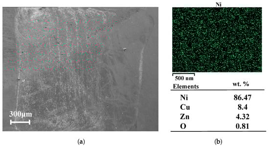 (a) The printed nickel square. (b) EDX element mapping for a small region of the printed nickel square and the corresponding wt.% of the detected elements.