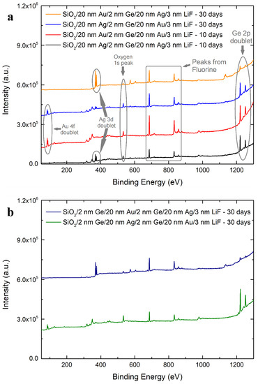 (a) X-ray photoelectron spectroscopy (XPS) spectra of sandwich-like structures where 2-nm-thick germanium film is deposited in between 20-nm-thick Ag and Au layers, when the Au is at the bottom (orange curve) or at the top (blue curve). For comparison, spectra for structures where the germanium is deposited between two layers of the same metal, from refs [38,39], are also presented. (b) XPS spectra of similar structures, but with an additional Ge film at the substrate/metal interface. The intensity curves on both figures are offset by different values for clarity of reading.