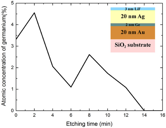 To investigate the full concentration profile of germanium atoms as a function of subsurface depth in the Au/Ge/Ag sample, we have performed a series of XPS measurements interlaced with Ar+ ion etching and determined the concentration of Ge atoms for each collected spectrum. The results are plotted in Figure 2. For a typical sample, where most of Ge atoms have segregated to the surface, the atomic concentration of germanium should be the greatest after 1−2 min of etching and then it should monotonously decrease with etching time [38,40]. In the case of the Au/Ge/Ag sample, the surface still exhibits the highest concentration of Ge atoms with respect to all subsurfaces (except for the spectrum collected prior to any ion etching, where lithium and fluorine from the LiF film as well as adventitious carbon and oxygen adsorbed from air are also detected). This means that the Ge surface segregation, although inhibited, is not canceled completely. However, the Ge concentration profile is not monotonous, as would be expected form a typical sample in which Ge atoms segregate. Instead, after 8 min of etching, which essentially represents the middle of the sample (and thus, the depth that the Ge was deposited at) there is another maximum. This implies that a lot of atoms still reside at the boundary of Ag and Au films. After further etching, the concentration of germanium drops slowly, which suggests that some germanium atoms have migrated towards the gold/substrate interface through Au grain boundary diffusion. We conclude that due to high adhesion of Ge to Au, there is a smaller energy benefit of germanium atoms segregating to the surface than in the case of samples without the bottom Au layer.