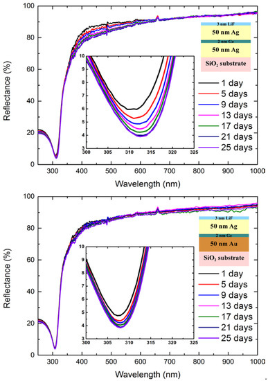 To verify whether inhibited segregation of germanium in an Au/Ge/Ag sandwich translates to differences in the optical domain, we have performed reflectivity measurements. Figure 3 presents the normal reflectance spectra of sandwich structures for different time periods after the fabrication of the samples. In this case, however, the metal layers have to be as thick as 50 nm, so that the top metal layer is non-transparent. That way, the measurement result does not depend on the optical properties of the bottom metal layer. In the case of the Ag/Ge/Ag sample, where germanium is between two layers of Ag, there is a noticeable time evolution of the reflectance curve. As time passes, the reflectance drops by nearly 10% in the range of 350 to 600 nm. For instance, on the first day after deposition, the reflectance at 450 nm is 87.5%, while after 25 days, it drops to 81%. Moreover, the position of the minimum in the reflectance spectrum changes from 310 nm on the 1st day after deposition to 312.5 on the 25th day. This correlates with the 2-nm redshift in the electron energy loss function maximum for Ge-wetted silver samples measured in an earlier work [38]. These effects imply the undisturbed occurrence of segregation of germanium atoms within the top Ag layer. For the sample where the bottom Ag layer has been replaced with Au, these effects are also observable, but are much less intense—the reflectance at 450 nm drops only by 2 percentage points and the position of the maximum redshifts by only about 0.5 nm. This is a clear indication that the segregation of germanium within the top Ag layer is inhibited. It is also worth noting that, for both samples, the curves after 25 days do not change much anymore, which suggests that the segregation process has completed.