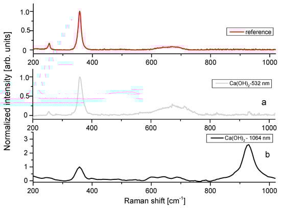 The target of our investigation is to assess the origin of the excitation-dependent band in the range of 700–800 cm−1, observed in calcium hydroxide only under 1064 nm laser excitation. The discussion of the results is carried out by a comparison to the features at low and high wavenumbers (vide infra). The starting point is the vibrational spectrum of unheated fresh Ca(OH)2 samples under different wavelength excitations (532 nm, 632.8 nm, and 1064 nm). In Figure 1, we compare a reference spectrum excited at 532 nm [29] to the spectra of our synthesised samples excited at 532 nm (Figure 1a) and 1054 nm (samples not subjected to thermal treatments–Figure 1b). The reference spectrum displays two narrow bands at about 252 and 357 cm−1 and a large composite band peaked at about 680 cm−1, already assigned to the vibrations of the OH- against the cations (two translational and one rotational Eg and A1g modes) [30]. As reported in the figure, the spectra of our samples excited both in the visible and NIR range report the same vibration bands (the same result also holds for the 632.8 nm, not reported here for the sake of brevity). The spectrum excited at 1064 nm evidences a large band peaked at about 936 cm−1, previously ascribed to the O–H out-of-plane bending mode of unbound water [31,32]. The reported spectra do not show any contribution in the 700800 cm−1 range irrespective of the laser excitation exploited, in contrast to the literature spectra of aged calcium hydroxide gathered under 1064 nm excitation.