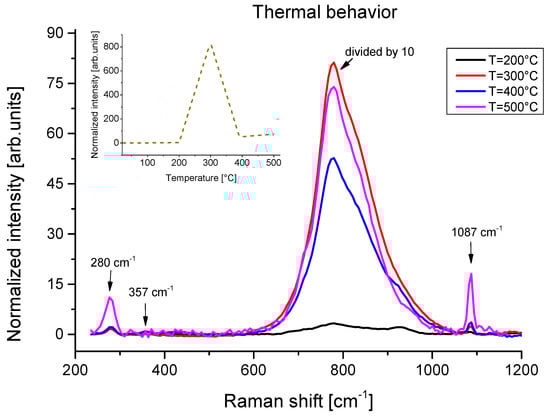 Figure 2 shows the Raman spectrum of the Ca(OH)2-heated samples at different temperatures (all the thermal treatments were carried out for 1 h). Besides the three vibrational modes previously reported (at 252, 357, and 680 cm−1), the spectra are characterised by a large and composite contribution at 780 cm−1 and two new smaller peaks at 283 and 1087 cm−1. In order to evidence the dependence of the 780 cm−1 band on the temperature, the spectra were normalised to the calcium hydroxide contribution at 357 cm−1 (for this reason the Ca(OH)2 bands appear as faint contributions in the figure). The intensity of the 780 cm−1 band increases as the temperature increases up to 300 °C; then, it largely decreases, as reported in the inset of the figure. At the final investigated temperature (500 °C), the relative contribution of the two new bands at 283 and 1087 cm−1 increases, showing the formation of calcite (external Eg and internal A1g modes, respectively) [4,33].