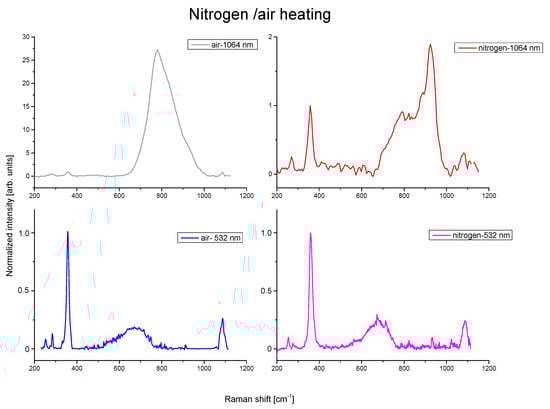 The observation of the two calcite bands suggests that the carbonation process is ignited by the thermal treatment. In order to understand the possible connection between the formation of the 780 cm−1 luminescence band and the carbonation process, we carried out the thermal treatment at 300 °C (corresponding to the maximum recorded for the 780 cm−1 intensity) under different environments, namely in air and under nitrogen flux. The latter was exploited to eliminate the presence of other possible reactive gasses, such as CO2 and O2 present in air. The Raman spectra of lime paste heated in air and in nitrogen at 300 °C and excited at 523 and 1064 nm are reported in Figure 3. The intensities are arbitrarily normalised to the peak of calcium hydroxide at 357 cm−1.