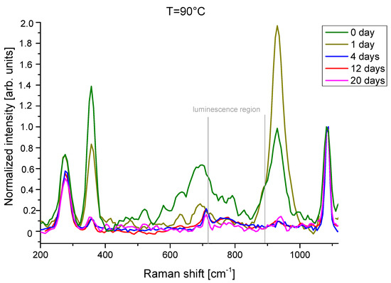 To further characterise the kinetics of the formation of the 780 cm−1 luminescence band, we investigated its temporal evolution by monitoring the Raman spectrum excited at 1064 nm for several days. The analysis was carried out on the samples treated at different temperatures by leaving them in the air at room temperature and under standard RH conditions (60%). Figure 4 shows the spectra for the samples heated to 90 °C and arbitrarily normalised to the 1087 cm−1 calcite peak. In the luminescence region, no emission bands are detected, whilst the peak of calcium hydroxide (357 cm−1) decreases during the time, suggesting that the carbonation of lime paste takes place.