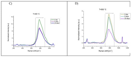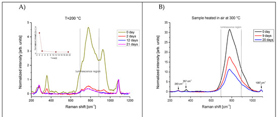The Raman spectra of the sample heated to 200–500 °C are reported in Figure 5. In general, the luminescence band at 780 cm−1 is observed for all the temperatures at the time zero spectrum and it undergoes a large decrease as a function of time (see inset). The contribution of free water is clearly singled out only in the time zero spectrum of the sample treated at 200 °C spectra, whilst in the other cases no free water contribution is detected, suggesting that, as expected, at a higher temperature the whole nested water is eliminated by the thermal treatment. The whole set of samples displays the formation of calcite in the first days of observation.