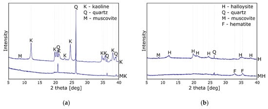 Both kaolinite and halloysite are considered to be the polytypical forms of aluminum monophyllosilicate with 1:1 packets []. They differ in the way the layer packages are arranged in the crystal structure []. The kaolinite crystals have a lamellar habit. The shifting of two layers relative to each other, tetrahedral (Si–O) and octahedral (Al–OH), creates a tubular halloysite structure. The characteristic feature of halloysite is also the presence of water molecules in the inter-package space. The presence of water causes an increase in the distance between the layer packs, where for halloysite it is 10.1 Å, while for kaolinite, this is 7.15 Å. Both minerals dehydroxylate at 600–800 °C []. As the products, more active amorphous metakaolin and metahalloysite, are obtained.