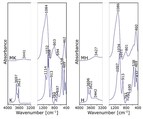 Figure 2 presents the mid-infrared absorption spectra of kaolin and halloysite (marked as K and H, respectively) and their calcination products (MK and MH). The strong similarity between the spectra of the samples of kaolin and halloysite can be observed due to the structural similarity of both materials. The bands in the range of 1100–400 cm−1 are associated with the aluminosilicate structure of the material, and come from the vibrations of the Si–O–Si(Al) bridges. The band at 913 cm−1 is characteristic of the kaolinite structure, and comes from Al–OH stretching vibrations in the octahedral layer. The band at 695 cm−1, in turn, comes from the vibrations of the Al–O bond for aluminum in the octahedral position. In the spectra of all samples, a characteristic doublet of bands at about 800 and 780 cm−1 can also be seen, indicating the presence of quartz.