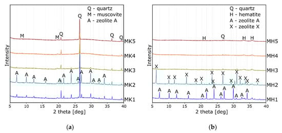 As expected, zeolite A was formed as the result of activation with the highest sodium solution content (MK1 and MH1 samples). Interestingly, in the case of metakaolin (Figure 3a), the activation with the solution with a slightly lower Na/Si ratio (comparing MK1 and MK2) gave the greater amounts of zeolite A. The probable reason was the increased proportion of silicon in the solution in the first stages of the geopolymerization process [,], which promoted the condensation of tetrahedra into the double-6-ring units, characteristic for LTA structures. In the case of halloysite (MH2), zeolite X was formed under the same conditions. The literature data indicate [] that this zeolite can be obtained using a longer synthesis time, or in reaction systems with a higher silicon content. It can therefore be assumed, that either the metahalloysite dissolved faster than the metakaolin, or the halloysite contained more silicon in the active phase (despite the similar silicon content in both raw materials (Table 1), metakaolin contained inert quartz (Figure 1)). In the systems with higher silicon content (MK3–MK5 and MH3–MH5), zeolite phases were not formed.