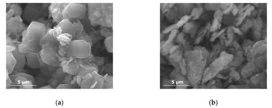 The presence of zeolite phase was confirmed by the SEM observations. The selected results are shown in Figure 4 and Figure 5. Especially in the samples containing zeolite A (MK2; Figure 4a), the cubic crystallites surrounded and joined with a layer of amorphous phase were visible. Zeolite X obtained in the analogous conditions had less developed morphology (MH2, Figure 5a), hence its identification was difficult [].