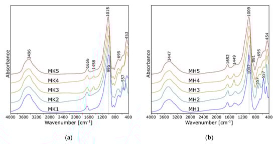 First, the slight shift of the most intense band located at about 1000 cm−1 with the increasing amount of water glass can be observed. On the one hand, the reason may be the increasing share of silica in the structure. On the other hand, the degree of structure polymerization can be increased, which would explain the systematic increase in the compressive strength of the MK1–MK5 samples, and which agrees well with the microscopic observations. The analogous conclusions can be drawn by interpreting the spectra of the series of samples based on metahalloysite (MH1–MH5). This observation agrees with our previous conclusions [].