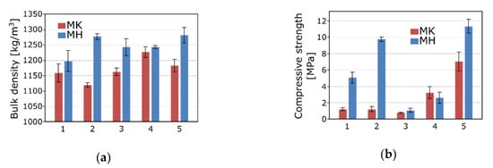 The bulk density and compressive strength of the geopolymer samples after 28 days of maturation were determined. The results are shown in Figure 7. Generally, the strength achieved by geopolymers based on clay minerals is relatively low compared to materials based on fly ash or blast furnace waste []. In the case of this work, these values did not exceed 12 MPa. The highest compressive strength values were achieved for the samples MK5/MH5. This is in line with the literature data [], which indicates that the higher the silicon content in the activator, the higher the strength parameters. It is related to the content of the amorphous phase, that is, the higher the glassy content, the more visually homogenous gel structure (Figure 4 and Figure 5), which have possibly contributed to its high strength after the activation.