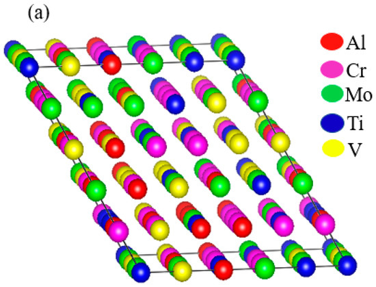 The elastic constants were calculated using Le Page and Saxe’s stress-strain method [31,32] on MedeA software. The stress tensor was calculated using analytic expressions. To ensure that the equilibrium structure corresponded to zero strain, the initial optimization of the theoretical cell parameters was made with high accuracy. The k-spacing was set as 0.2 per angstrom. Plane-wave cut-off energy of 500 eV was used. The geometry convergence criterion was set to 0.02 eV/Å, and the SCF convergence criterion to 10 × eV. The k-mesh was forced to be centered on the gamma point. After calculating the elastic constant, the Voight–Reuss–Hill approximation [33,34] was used to calculate the mechanical properties of the RHEAs. The mathematical relations for calculating bulk modulus (B), shear modulus (G), Young’s modulus (E), and Poisson ratio () are listed in the following equations: