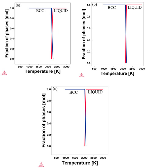 To provide more information on our initial structural prediction of the candidate alloys, the CALPHAD based Thermo-Calc software with the TCHEA1 database was employed to compute the phase diagram. The calculated equilibrium phase diagrams of the designed RHEAs are shown in Figure 2. The range of calculated temperature in the graph was from 900 K to 3000 K. As can be seen from the diagram, all the designed alloys keep the stable BCC phase at a high temperature of more than 2000 K, with no sign of phase transformation. According to the Thermo-Calc software, the melting point of Al20Cr20Mo20Ti20V20, Al20Cr20Mo10Ti20V30, and Al30Cr10Mo5Ti20V35 were 2190 K, 2137 K, and 2025 K, respectively. The XRD patterns reported by Kang et al. [8] show the existence of a single BCC crystal structure in Al20Cr20Mo20Ti20V20. This experimental finding agrees with our prediction for Al20Cr20Mo20Ti20V20. Considering the experimental agreement and validation of the TCHEA1 database prediction according to a previous publication [19,20,21,22], we expect that future experimental results may confirm our phase prediction findings for Al20Cr20Mo10Ti20V30 and Al30Cr10Mo5Ti20V35.