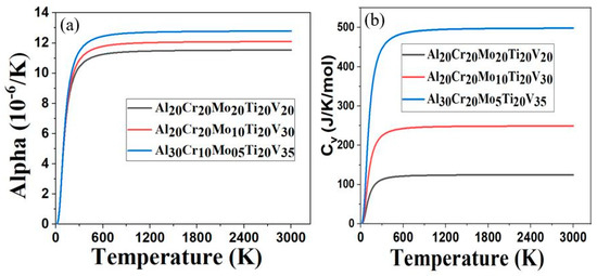 The thermal coefficient of linear expansion, alpha (α), as a function of temperature for Al20Cr20Mo20Ti20V20, Al20Cr20Mo10Ti20V30 and Al30Cr10Mo5Ti20V35 RHEAs is shown in Figure 3a. The calculated Debye temperature (θD) of Al20Cr20Mo20Ti20V20, Al20Cr20Mo10Ti20V30, and Al30Cr10Mo5Ti20V35 were 428 K, 443 K, and 451 K, respectively. The higher value of θD in materials reflects the strength of the covalent bond component in materials [50]. This reveals that the covalent bond component inside Al30Cr10Mo5Ti20V35 could be stronger than the other two RHEAs, as it has a higher value of θD. We found that the α increases rapidly as temperature increases from 0 K to 200 K, and slowly becomes linear at temperatures above 600 K for the given RHEAs. The value of α for Al30Cr10Mo5Ti20V35 is similar to that of Al20Cr20Mo20Ti20V20 and Al20Cr20Mo10Ti20V30 at temperatures below 200 K, but its α increases rapidly at temperatures above 298 K. This variation of the thermal coefficient of linear expansion indicates that the α of Al30Cr10Mo5Ti20V35 is very sensitive at temperatures above 298 K. It may be due to the addition of low-density elements such as Al and V in the RHEAs. Figure 3b shows the specific heat capacity at constant volume, Cv, as a function of temperature between Al20Cr20Mo20Ti20V20, Al20Cr20Mo10Ti20V30, and Al30Cr10Mo5Ti20V35. At low temperatures below 50 K, the Cv of all three RHEAs has identical behavior. At higher temperatures above 50 K, the Cv of Al30Cr10Mo5Ti20V35 > Cv of Al20Cr20Mo10Ti20V30 > Cv of Al20Cr20Mo20Ti20V20. This trend implies that the lowering of the high-density elements Mo and Cr increases the Cv of Al30Cr10Mo5Ti20V35. Since the specific heat capacity of Al30Cr10Mo5Ti20V35 is higher, it can absorb more heat than the other two RHEAs. We are not aware of the experimental report for the thermal properties of the present RHEAs, and future experiments will likely confirm our thermal properties results.