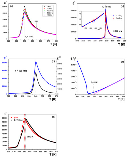 The ε’(T) measured after poling in the electric field having the strength of 7 kV/cm revealed a shift of TC of the order of 1 K, which most probably is the result of the influence of pyroelectric effect on permittivity while approaching the transition point (Figure 1e), rather than a change of symmetry under electric field action, as observed for PZTs from morphotropic phase boundary [30].