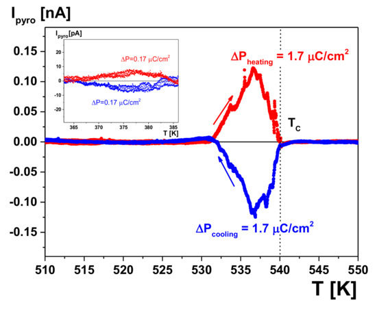 The pyroelectric current of the sample was registered by means of Keithley 6514 System Electrometer on heating and cooling, with the constant rate of 3 K/min. The measurements were performed in the temperature range from 300 K to 600 K, which covered the points of phase transitions. The pyroelectric current was also measured on heating of polarized single PbZr0.87Ti0.13O3 crystal. Prior to measurement, the sample was poled in d.c. external electric field having the strength of 7 kV/cm, applied for 20 min in 350 K and subsequently cooled in this field to 300 K, at which temperature the field was switched off. Then the sample was heated applying the rate of 3 K/min, to 600 K, with pyroelectric current registered.