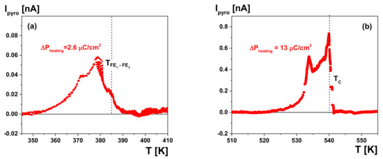 Changes of pyroelectric current Ipyro on heating for polarized PbZr1−xTixO3 (PZT) single crystal near phase transition: (a) between two ferroelectric phases; (b) around TC. The runs were obtained after subtraction of background coming from thermally stimulated currents. It has to be remembered that the Ipyro is the total pyroelectric current which originates from the primary and secondary pyroelectric effect, and is not related to changes of spontaneous polarization only, i.e., only to primary pyroelectric effect.