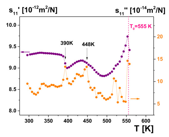 Changes in elastic properties taking place with temperature were determined for the crystal poled in strong electric field and are presented in Figure 4. The imaginary part of the elastic compliance s11’’ has anomalies at about 390 K and 448 K. Starting from 520 K, the s11’’ value fluctuates and reaches its maximum value around 555 K. Similarly, the real part of the elastic compliance s11’ reveals abnormal behavior at 390 K, 448 K and 554 K. What is interesting is that both coefficients, determined based on piezoelectric resonances, vanished at the temperature that well corresponds to the T0 obtained from linear fit of high temperature run of reciprocal permittivity (Figure 1d). Except for transition between two ferroelectric phases, other local anomalies have been observed at different temperatures (Figure 3 and Figure 4). The reason is that the pyroelectric current and elastic compliance were measured with different heating rates. It should be noted that the temperature of 448 K is related to a transition associated with lattice instability, reported by Cordero et al. and Lazar et al. [7,8,9].