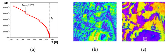(a) Temperature changes of ∆n (T) in the single PbZ0.87Ti0.13O3 crystal. The values of ∆n were calculated for a region of 25 μm × 30 μm which is shown inside the white square in (b) and (c); (b) maps of birefringence at 540 K are also a proof of complex domain structure of the investigated crystal. Different colors correspond to different domains with different orientations of optical indicatrix; (c) optical indicatrix orientations at 540 K. This region has been chosen in order to be within the domain of defined orientation of optic indicatrix.