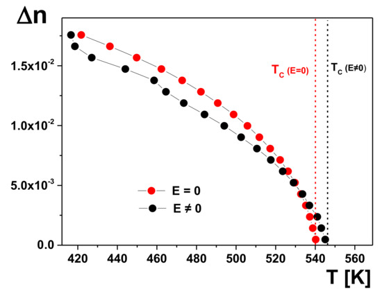 Figure 6 shows the influence of this field on ∆n(T) function for a single PbZ0.87Ti0.13O3 crystal. The calculations of birefringence were carried out for a region inside the domain, having the surface area of 25 × 30 μm2. The electric field slightly reduced the ∆n value, but shifted the temperature at which birefringence disappears towards higher values. In a crystal subjected to d.c. field having the strength of 7 kV/cm, the birefringence disappeared at 548 K, i.e., distinctly higher than TC, as expected for ferroelectric transition. It should be remembered that the strongest changes of elastic coefficients s11’ and s11’’ were also observed near T0 (Figure 4).