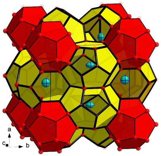 The synthesis and characterization of new intermetallic clathrate phases has been a focus area of research for many groups [2,3,9,10,11,12,13]. Our group has also been involved in these topics, and in the last several years, we have identified several unique type-I and type-II clathrates [14,15,16,17,18]. Surveying the literature, one finds that the most common structure, among intermetallic clathrates, based on Group 14 elements, is the type-I structure, shown in Figure 1.