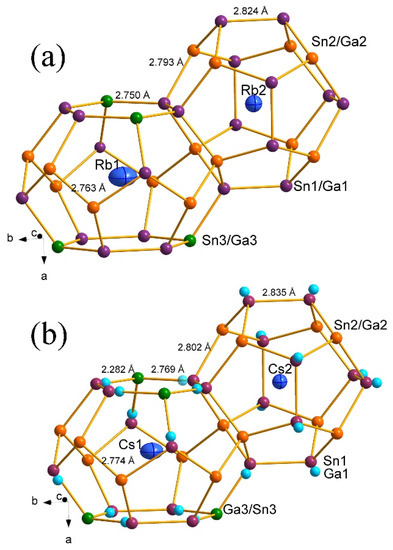 Fragments of the structure of (a) Rb8Ga7.1(1)Sn38.9 and (b) Cs8Ga7.5(1)Sn38.5. Sn1/Ga1 (Sn1 for Cs8Ga7.5(1)Sn38.5), Sn2/Ga2, Sn3/Ga3, (Ga1 for Cs8Ga7.5(1)Sn38.5) atoms are drawn as plum, orange, green, and light blue respectively. Displacement ellipsoids for guest atoms Rb and Cs atoms (blue) are shown at the 95% probability.
