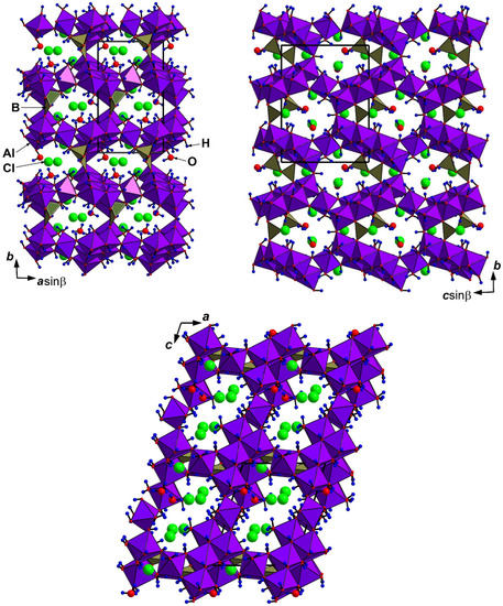 The aluminoborate pseudo-framework in krasnoshteinite is microporous and zeolite-like (Figure 2). The three-dimensional system of wide channels contains Cl− anions and H2O molecules. Together with OH groups and H2O molecules belonging to Al- and B-centered polyhedra, they form a complicated system of hydrogen bonds (Table 5).