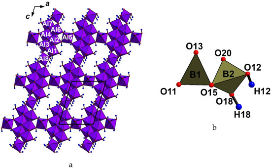 Boron atoms occupy two crystallographically non-equivalent sites and center B(1)O3 triangles and B(2)O2(OH)2 tetrahedra, which share a common vertex to form insular [B2O4(OH)2]4− groups (Figure 3b). According to the classification of fundamental building blocks (FBB) in borates [17,18], FBB in krasnoshteinite is 1Δ:Δ, i.e., the block with one triangle and one tetrahedron sharing corner. Krasnoshteinite is the first borate with such FBBs. These groups are connected with clusters of Al-centered octahedra via common vertices. Thus, a BO3 triangle shares one O vertex with a B-centered tetrahedron, one vertex with two Al-centered octahedra [Al(4) and Al(7)] of the layer, and one vertex with Al(1)- and Al(2)-centered octahedra of an adjacent layer (thus reinforcing the linkage between neighboring octahedral layers). A BO2(OH)2 tetrahedron shares one O vertex with a BO3 triangle, one O vertex with two Al-centered octahedra [Al(3) and Al(4)], and one O=OH vertex with a Al(5)-centered octahedron; all Al(3,4,5) octahedra belong to the same layer. The resultant aluminoborate pseudo-framework contains three-membered [2B + Al] rings. Such Al-B-O units are known in the porous aluminoborate frameworks as being crucial to stabilizing them [19,20,21]. The same configuration of the three-membered [2B + Al] ring was described in the crystal structures of satimolite, KNa2(Al5Mg2)[B12O18(OH)12](OH)6Cl4·4H2O [22], and synthetic porous Al borates, PKU-3 H24.3Al9B18O51Cl3.3·6.8H2O [23] and PKU-8 (H18Al7B12O36)Cl3(NaCl)2.4⋅6.5H2O [19].