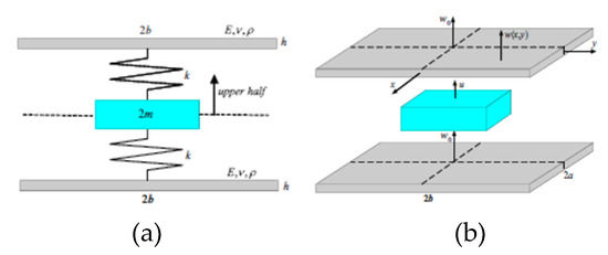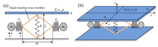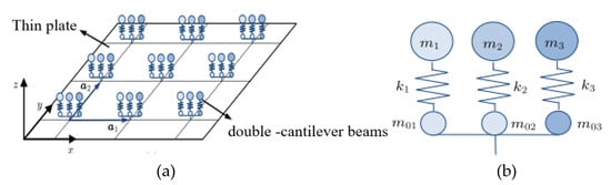 Simplified model of the proposed multi-frequency locally resonant phononic plate: (a) Schematic diagram of the simplified model with several periodic unit cells; (b) The low-frequency equivalent “mass-spring-mass” system of the attached double-cantilever beams [36].