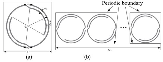 The schematic diagram of the double-opening Helmholtz periodic structure: (a) The unit structure’s cross section of the double-split Helmholtz resonant structure; (b) The finite structure with 5 cells of the double-split Helmholtz resonant structure [39].