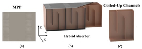 Schematic diagram of proposed structure: (a) The top micro-perforated panel; (b) Schematic of the hybrid metamaterial absorber; (c) Diagram of one coiled-up FP channel [57].