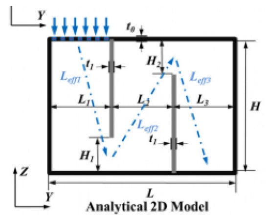 In 2011, Huang et al. [34] proposed two types of mass spring structures with local resonators and performed equivalent simulations, and found that they have negative effective elastic modulus and selective filtering. In 2016, Zhu et al. [35] periodically arranged a spring-vibrator resonance unit on a stiffened plate to obtain a local resonance stiffened plate structure (see Figure 4) and simulated its performance. They found that the structure can generate a lower frequency local resonance band gap and widen the high frequency Bragg band gap compared to ordinary stiffened plates.