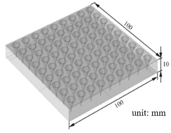 In 1988, Mironov found a similar phenomenon in a wedge-shaped structure. When the thickness of the thin plate structure is reduced as a power function (h(x) = Axm, m ≥ 2), the wave velocity of the bending wave will gradually decrease with the decrease of the thickness. Under ideal conditions, the wave velocity can be reduced. Wave reflections as small as zero are achieved [61,62]. In 2019, Liu et al. [63] designed an acoustic superstructure by embedding multiple acoustic black hole units in an array on a 10 mm thin plate (see Figure 19). It was found through experiments that the average sound insulation of the structure in the frequency band of 50–160 Hz can reach nearly 30 dB, and the average sound insulation in the frequency band of 100–600 Hz can reach 40 dB.
