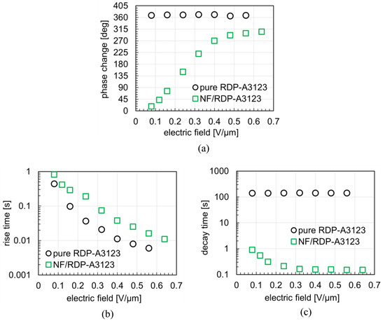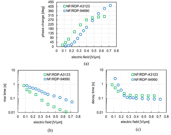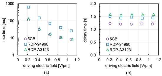 - Duong, T.Q.; Kobayashi, H.; Inoue, Y.; Moritake, H. Improved response time of thick liquid crystal device by using electrospun nanofiber. Jpn. J. Appl. Phys. 2017, 56, 61701. [Google Scholar] [CrossRef]