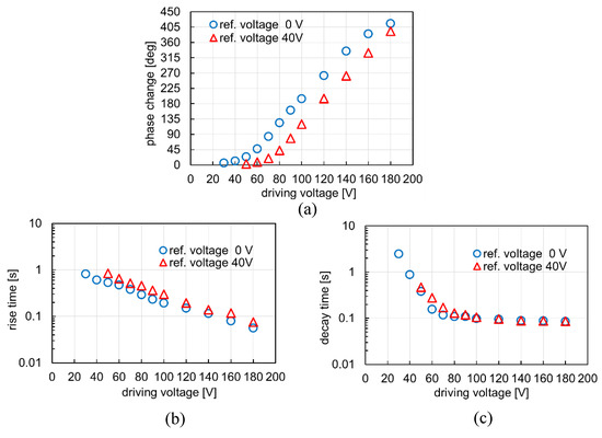 - Nguyen, T.; Umeno, S.; Higuchi, H.; Kikuchi, H.; Moritake, H. Improvement of decay time in nematic-liquid-crystal-loaded coplanar-waveguide-type microwave phase shifter by polymer stabilizing method. Jpn. J. Appl. Phys. 2014, 53, 01AE08. [Google Scholar] [CrossRef]