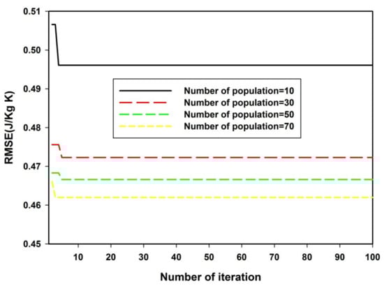 The dependence of the convergence of the developed GSA-SVR-radii and GSA-SVR-crystal models to the initial number of agents exploring and exploiting the search space are presented in Figure 1 and Figure 2, respectively. For the convergence of the GSA-SVR–radii model presented in Figure 1, the convergence to local minima was observed when ten, thirty and fifty agents explored the search space, while the model converged to a global solution when the number of agents was increased to seventy. Above this value, no further minimization of the objective function was possible. Similarly, Figure 2 presents the convergence for the GSA-SVR-crystal model that employs the crystal lattice parameters and the applied magnetic field as descriptors. The developed GSA-SVR-crystal model converged to a local solution when ten agents were exploring and exploiting the search space. The global solution was reached by thirty agents, while the increase in the number of initial agents returned the model to a local solution convergence. The optimum values of the SVR hyperparameters for the GSA-SVR-radii and GSA-SVR-crystal models are presented in Table 2. The table also presents the optimum activation functions and the number of hidden nodes for the developed ELM-GS-radii and ELM-GS-crystal models.