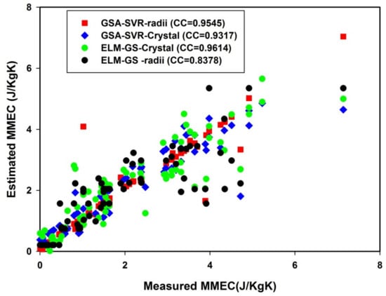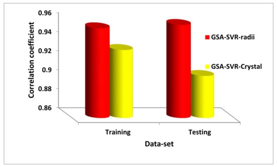 Comparison between the GSA-SVR-radii and GSA-SVR-Crystal models on the basis of the correlation coefficient.