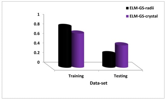 The developed ELM-GS-crystal model shows an improvement of 14.08% as compared to the ELM-GS-radii model at the training stage, whereas the latter performs better than the former with a percentage improvement of 36.44% at the testing stage of model development. In Figure 8, which presents the comparison on the basis of RMSE, the ELM-GS-crystal model shows a percentage improvement of 19.11% over the developed ELM-GS-radii model at the training stage, whereas the ELM-GS-radii model demonstrates a better performance of 39.35% at the testing stage. The actual values of each of the performance measuring parameters at different stages of model development are presented in Table 3. It is worth mentioning that although the developed ELM-GS-crystal model shows a better performance at the training phase, the excellent performance of the ELM-GS-radii model at the testing phase is more meritorious since the testing stage shows the future estimating capacity of the model.