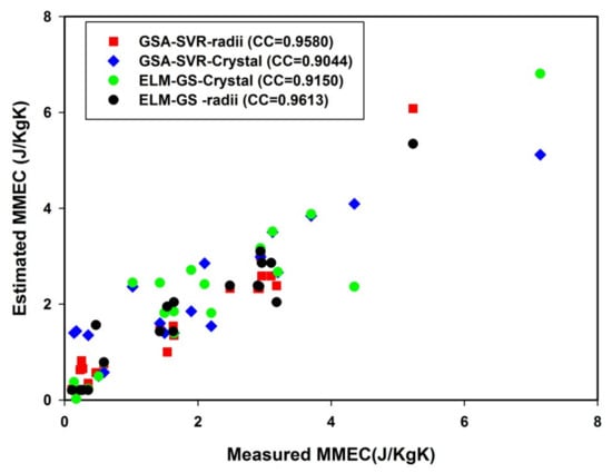 Comparison between the results of the developed GSA-SVR-crystal model and the measured values of the MMEC for different classes of manganite-based compounds.