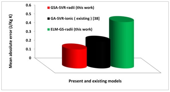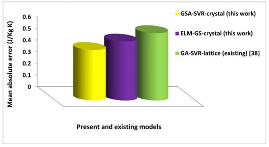 The developed GSA-SVR-crystal model performs better than the existing GA-SVR-lattice model [] with a performance improvement of 33.35% and 38.34% on the basis of MAE and RMSE, respectively. The developed ELM-GS-crystal model also performs better than the existing GA-SVR-ionic model with a performance enhancement of 14.39% and 20.65% using MAE and RMSE as performance measuring parameters, respectively. The observed precision of the developed crystal lattice distortion-based models over the existing model can be attributed to the strong mathematical background of the developed models as well as the excellent power of hybridization.