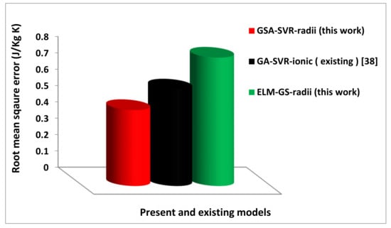 A similar improvement is presented in Figure 5 using RMSE as the performance measuring parameter. The prediction capacity of the developed GSA-SVR-radii model for the training dataset performs better than that of the GSA-SVR-crystal model with a performance improvement of 19.32%. while an improvement of 39.77% was obtained for the testing dataset. It should be noted that the testing stage of the developed GSA-SVR-radii model shows a better performance than the training phase of model development. This shows the robustness and uniqueness of the developed model in generalizing well to an unseen dataset. Another advantage of the developed GSA-SVR-radii model over the developed GSA-SVR-crystal model, aside from a better and excellent performance, is the ease of its descriptors. The descriptors for the developed GSA-SVR-radii model can be easily acquired without any prior experimental measurement, whereas XRD analysis must be performed before extracting the descriptors for the developed GSA-SVR-crystal model. Hence, the developed GSA-SVR-radii model allows pre-lab simulation and ultimately saves experimental time as well as other valuable resources.